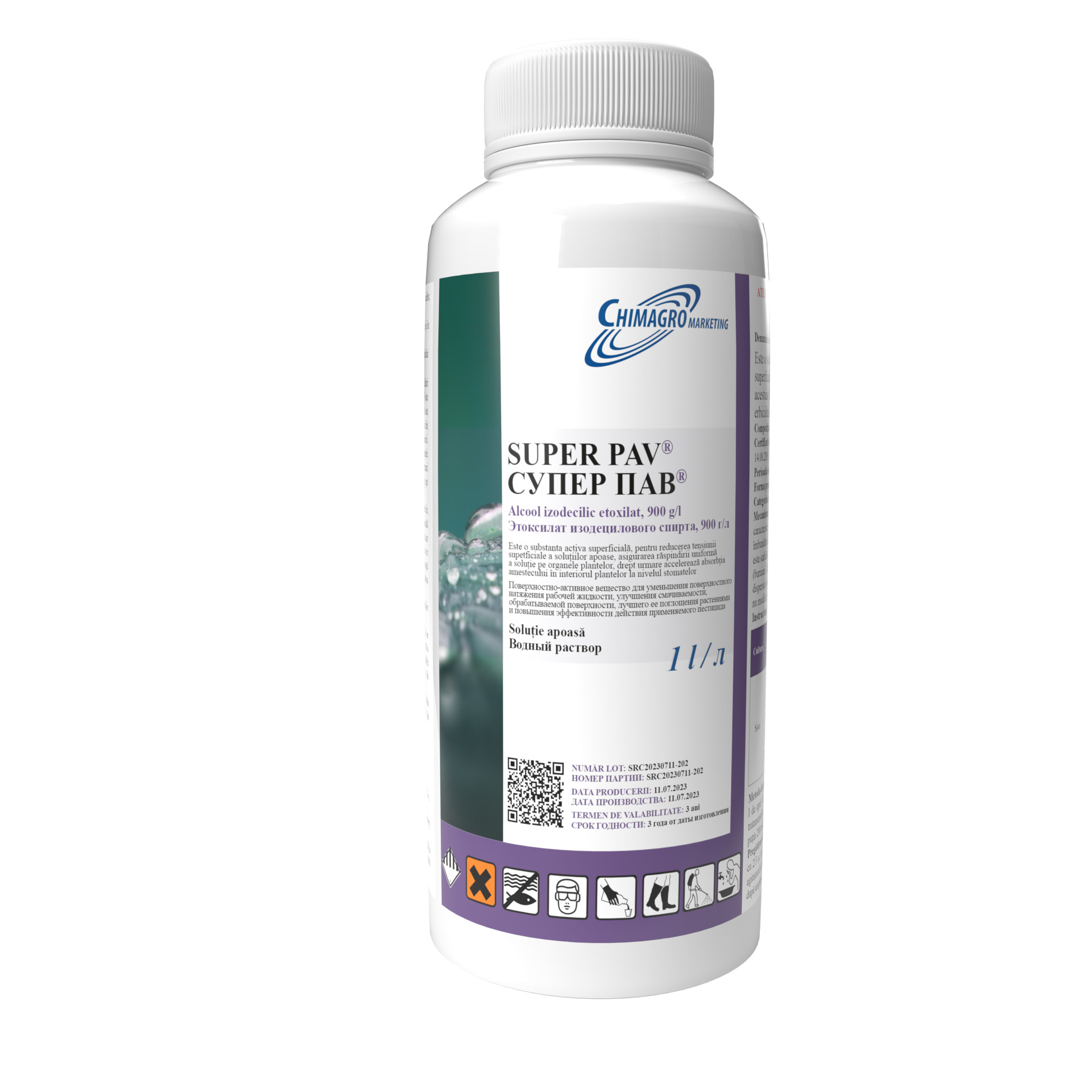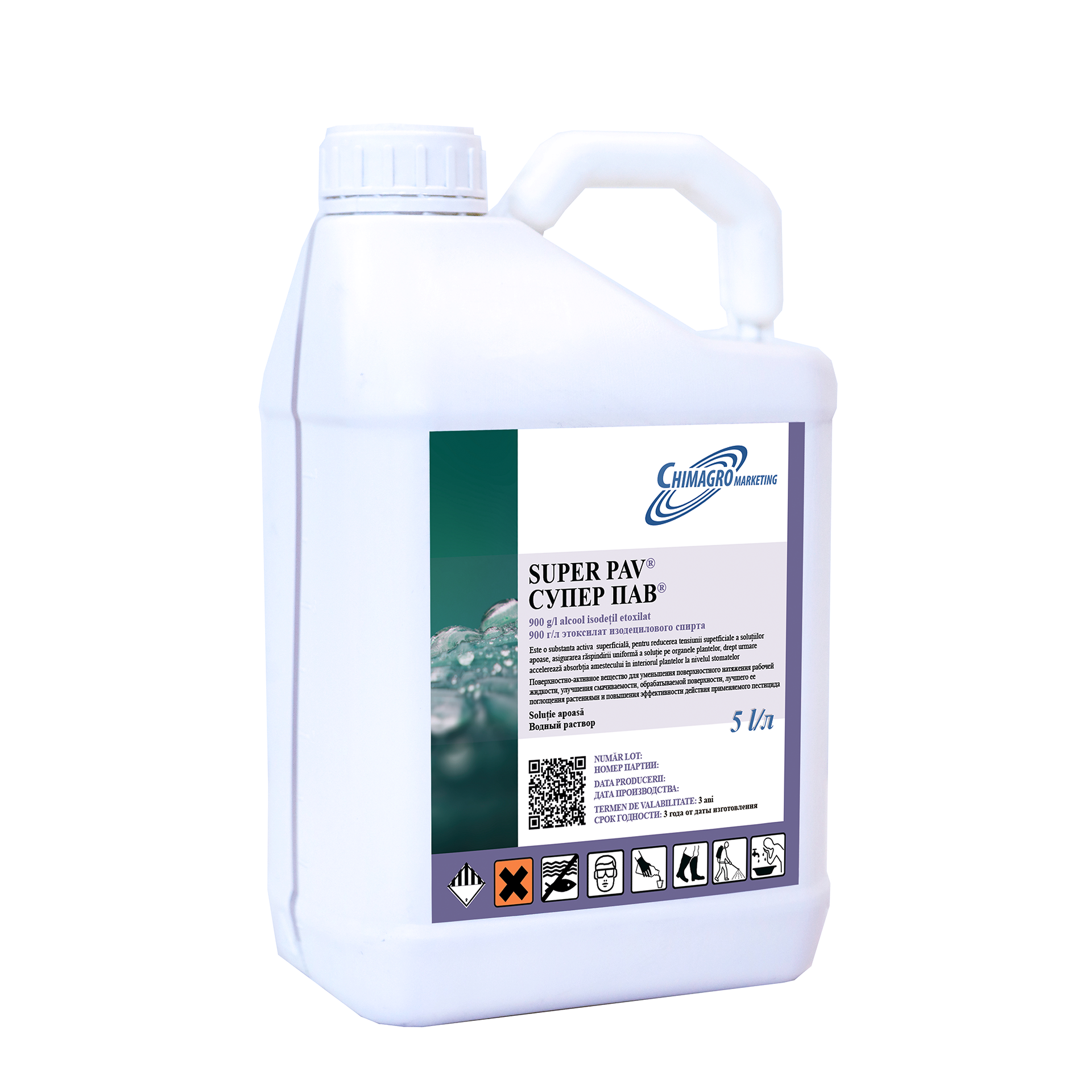 MECANISMUL DE ACȚIUNE: Super PAV, prin modificarea comportamentului caracteristic al proprietăților apei pe suprafețele umede, duce la o îmbunătățire a distribuției soluției de lucru. Rata de consum a soluției de lucru este stabilită în funcție de tipul de cultură, de localizarea obiectului dăunător (buruieni, dăunători, boli), de suprafața frunzelor, de masa tulpinii și de dispersia pulverizării. Etoxilatul de alcool izodecilic este o substanță neutră, nu modifică valoarea pH-ului soluției de lucru.